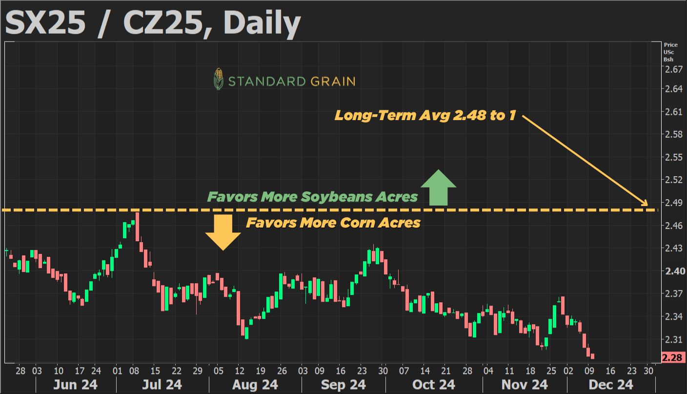 Here is a good chart from Standard Grain that shows Corn vs Soybean prices. Above that middle line favors more bean acres, below favors more acres.