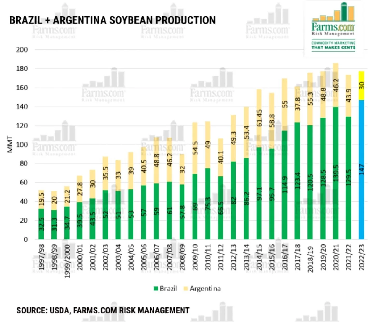 Next is from Farms.com Risk Management, notice they have Brazil and Argentina production not at a record. If our biggest competitor doesn’t have a record crop and it is down from a couple of years ago why wouldn’t we see prices do what they have the past couple of years? Especially if world demand is up, which it is. Especially considering our crush margins and the climate scam focus that has us using more renewable fuels like soybean oil for diesel.