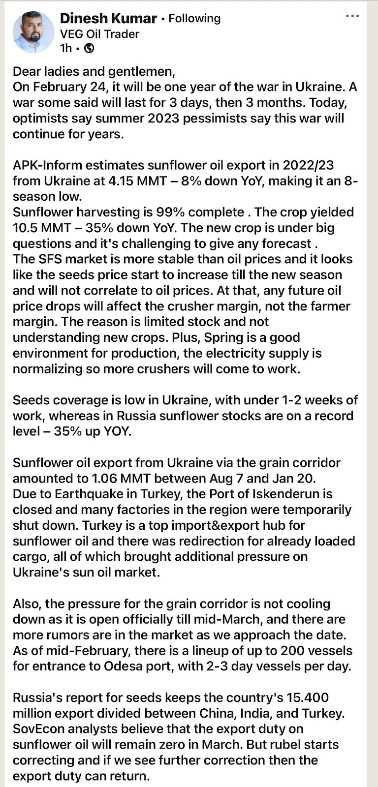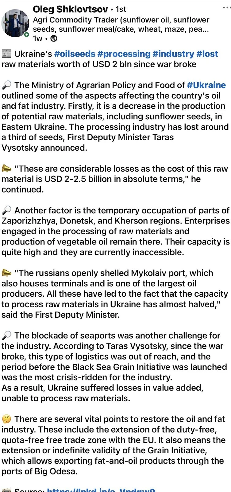 This is also from Linked In. Where it mentions that the processing industry in Ukraine has lost about a third of it’s seeds.