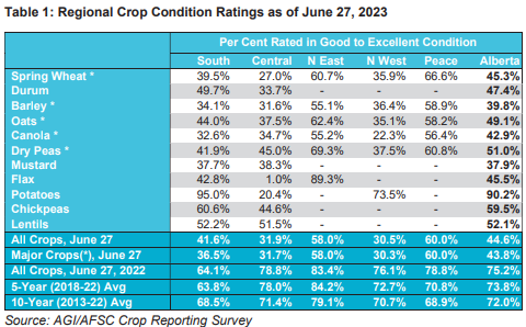 If we take a look at Canadian durum wheat in Alberta, Canada. It came in only 47% rated good to excellent. A 16% drop over the course of just 14 days.