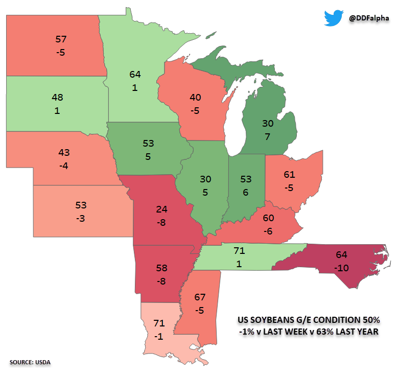 Unlike corn, soybeans conditions fell again. Falling 1% to 50% rated good to excellent. This was a bullish surprise, as the trade was expecting ratings to actually improve by 1% to 52% rated good to excellent. Just like corn, much of the I-states saw some good improvement. Part of the reason we didn’t see a ton of reaction to the decrease in ratings was, firstly a lot of this was already priced in, and secondly, the top 4 producing states all saw improvements.