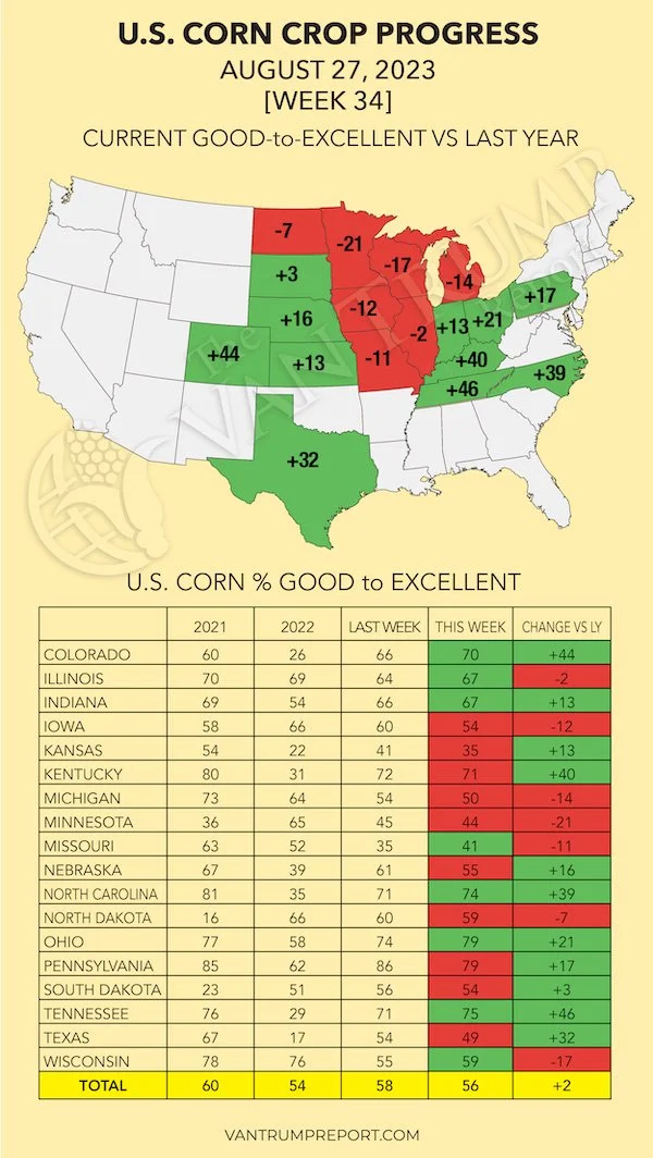 This was the 8th time this month that corn has tried to close over $5 and failed, as today we had a high of $4.99 1/2, and we still haven't got a close above $5 since August 2nd. More on the charts a little later. First let's go over yesterday's crop conditions.