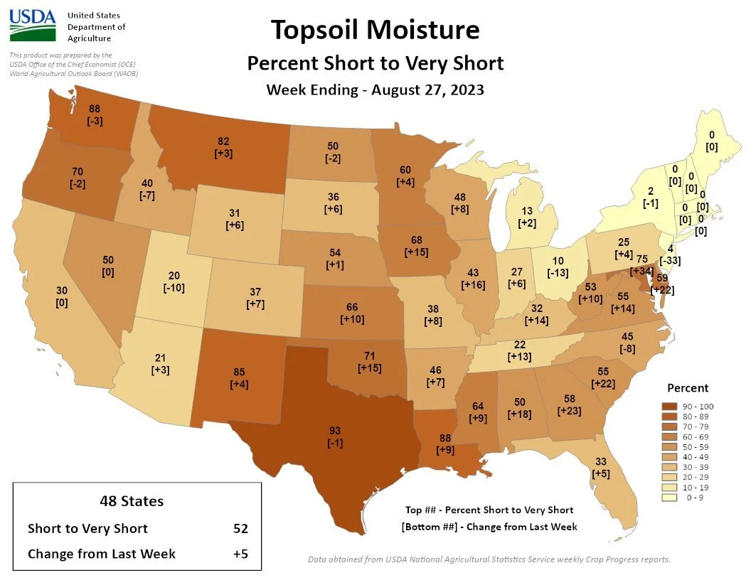 52% of the US is very short to short topsoil currently. A 5% increase from last week. This is the highest number for the end of August since the USDA began tracking this data back in 2015.