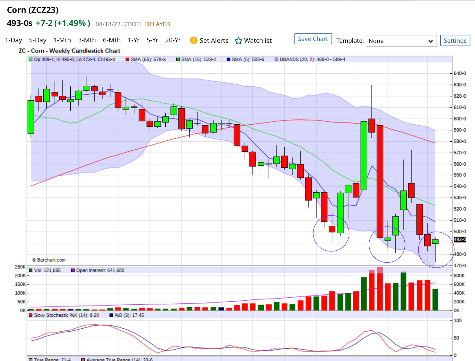Look at this December corn weekly chart. Notice the tails when we made new lows, followed by the reversal higher.