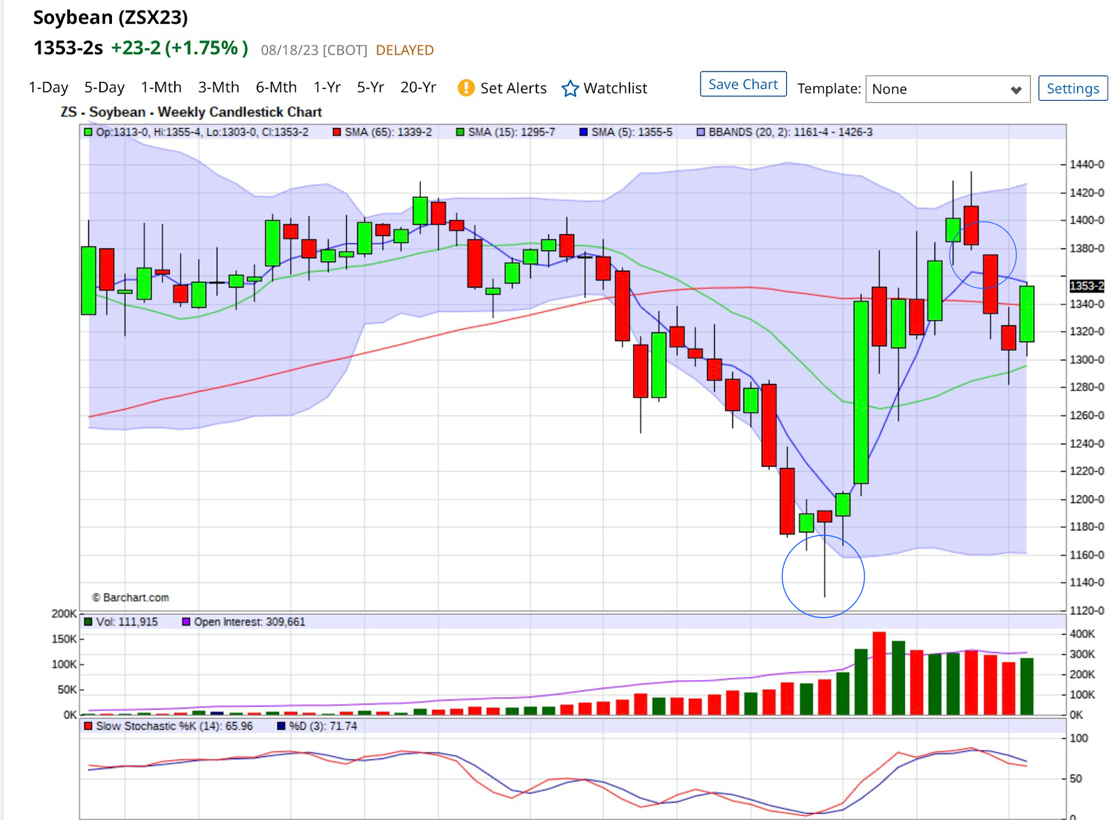 The weekly soybean chart looks like it wants to fill the gap we left a few weeks ago and then perhaps test the highs we had. With demand solid, dry and hot in the forecast don’t rule out new highs despite us getting closer to harvest.