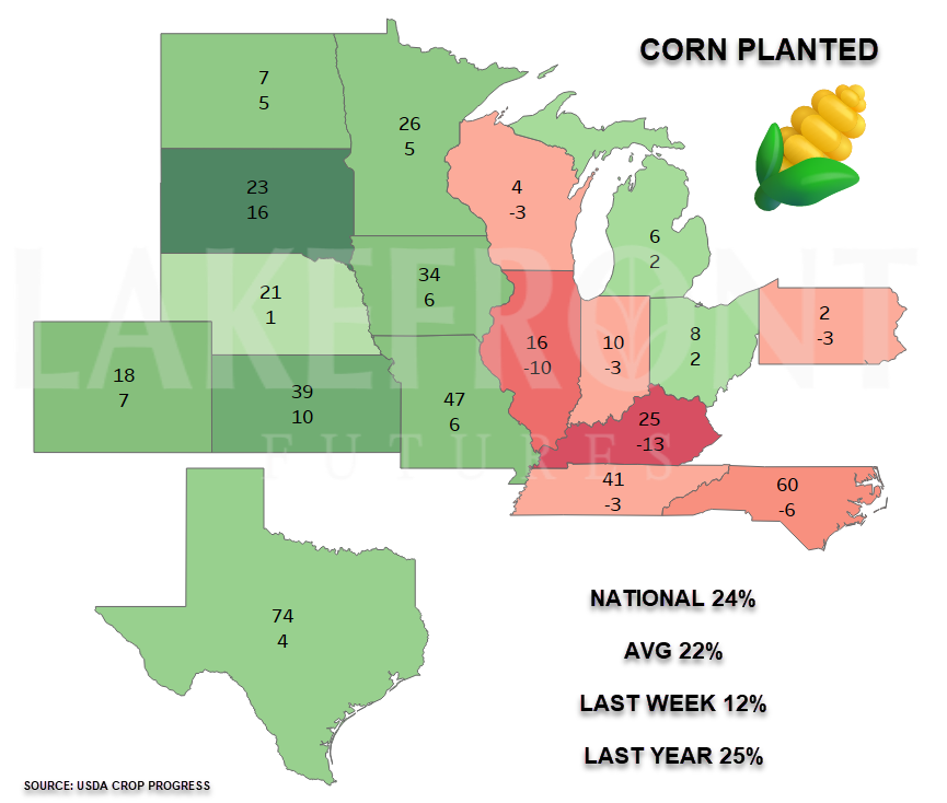Progress is ahead of usual for most of the corn belt aside from some eastern states such as Illinois and Indiana.
