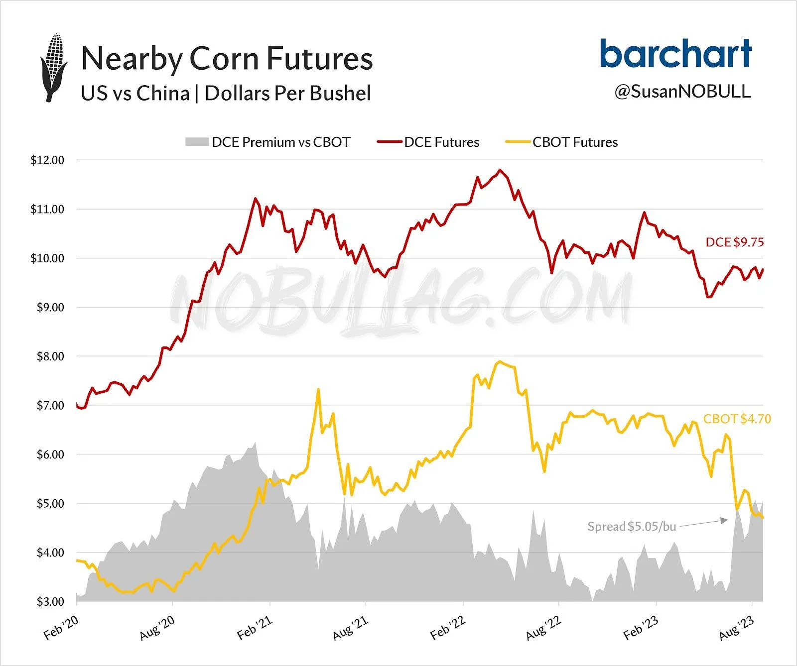 But here is something that does matter. Remember this chart from a few weeks ago from No Bull Ag that shows the spread between China vs US corn had reached over $5.00 a bushel. The largest since fall of 2021.