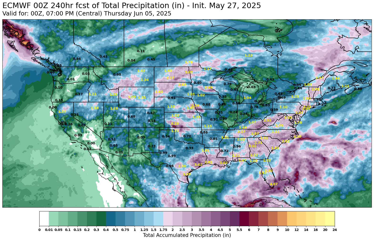 First here is the Euro model. In the 10-day outlook it shows good rains for the western corn belt, while the heart of the corn belt remains dry (The I-states).