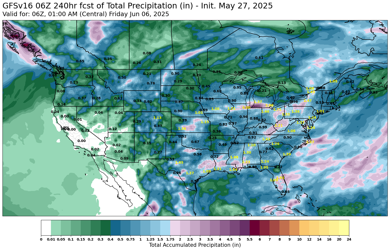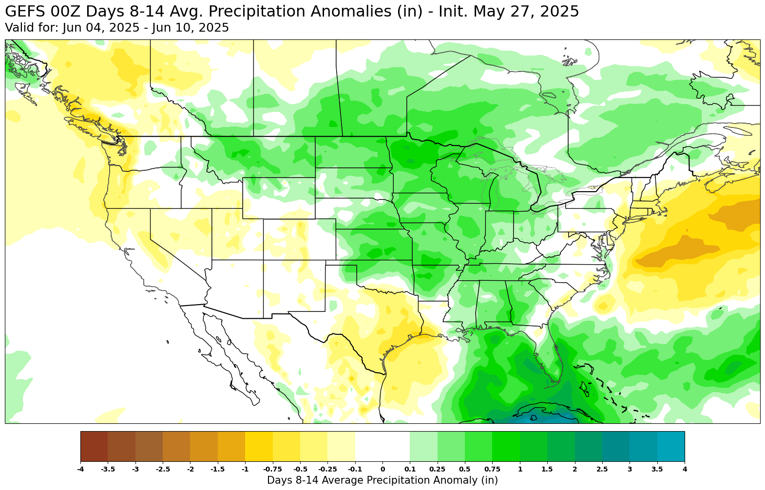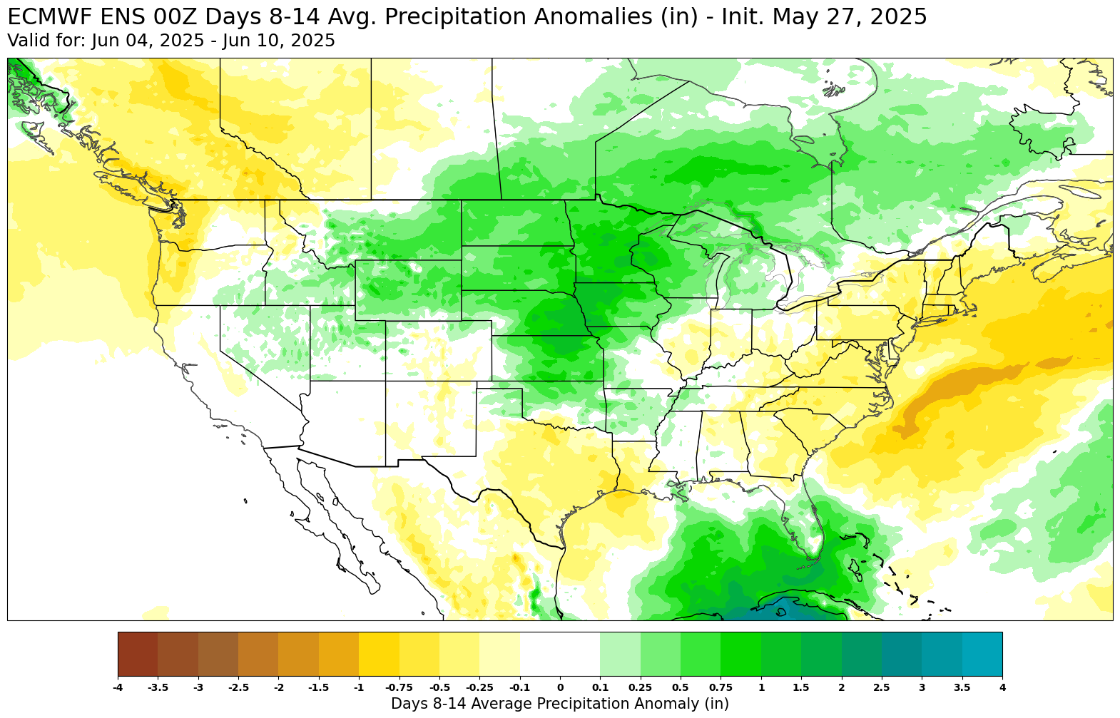 It has the western corn belt being dry, while having the heart of the corn belt getting good rain. With some areas of northern Illionois and Indiana getting up to +4 inches of rain.